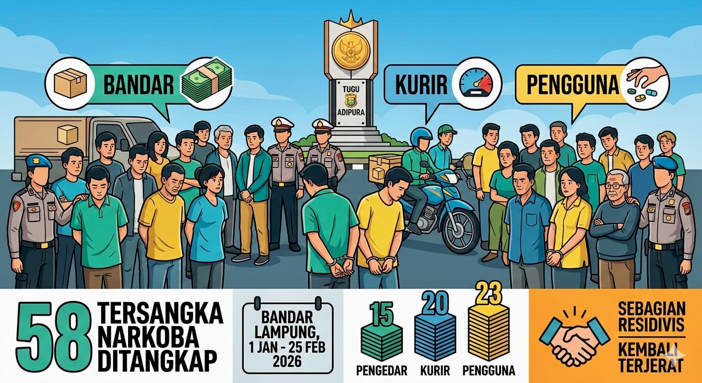 BANDARLAMPUNG – (PeNa), Satresnarkoba Polresta Bandar Lampung mencatat lonjakan pengungkapan kasus narkotika sepanjang awal 2026. Dalam periode 1 Januari hingga 25 Februari, sebanyak 42 kasus berhasil dibongkar dengan total 58 tersangka diamankan.