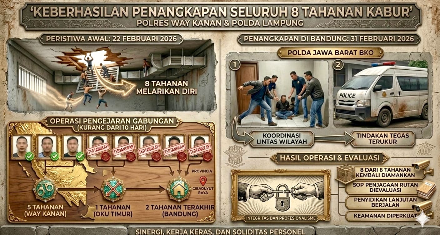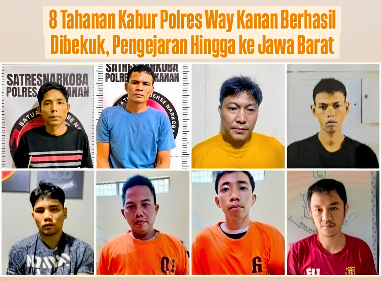 “Alhamdulillah, delapan tahanan yang melarikan diri dari Rutan Polres Way Kanan seluruhnya sudah berhasil diamankan. Ini merupakan hasil kerja keras, sinergi, dan soliditas personel Polres Way Kanan yang dibackup Polda Lampung serta jajaran kepolisian lintas wilayah,” ujarnya dikonfirmasi, Senin (2/3/2026).
