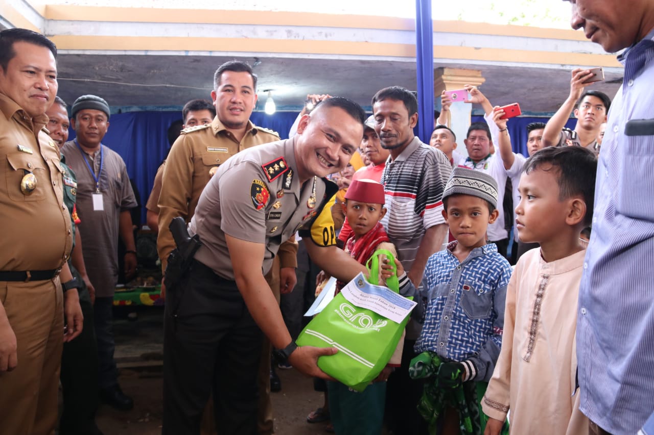 PESAWARAN-(PeNa), Kapolres Pesawaran AKBP Popon Ardianto Sunggoro ikut menyerahkan bingkisan kapada peserta khitanan massal di Bhakti Sosial PWI Pesawaran di Desa Bagelen, Senin (05/11).