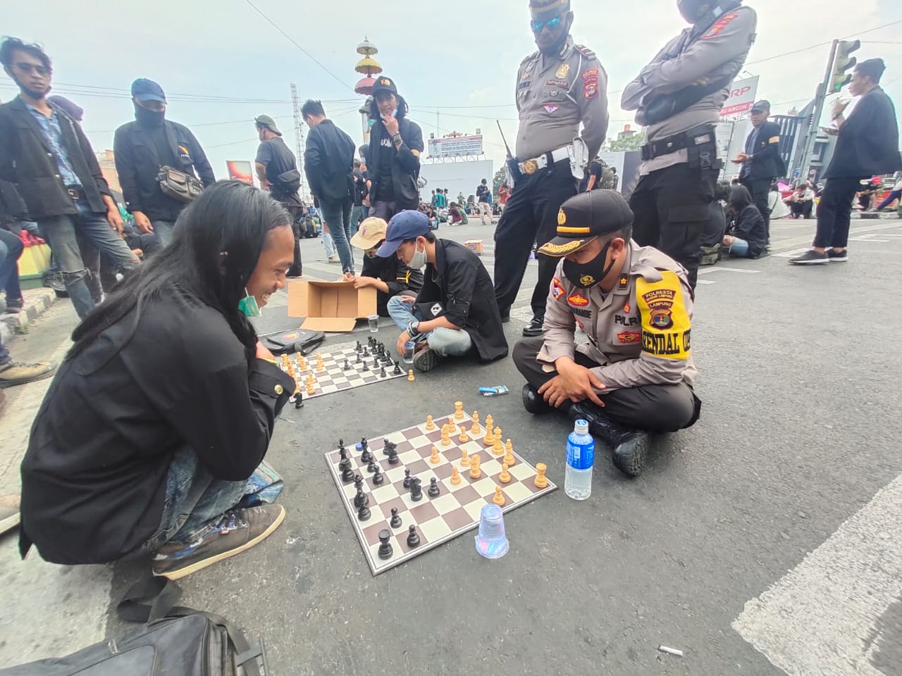 “Sambil aksi, agar ‘santuy’, enggak panas, kami bawa catur sambil ikut aksi,”