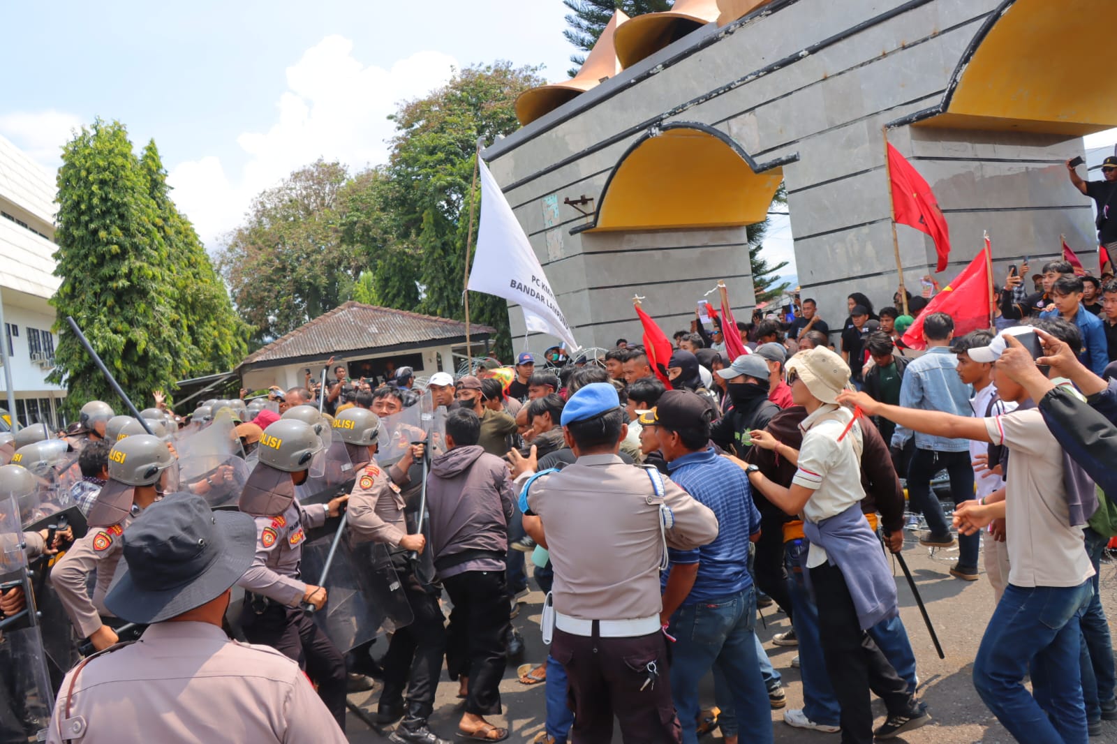 Massa yang kecewa mulai memaksa masuk ke area dalam kantor gubernur. Aparat kepolisian yang berjaga mencoba meredam dorongan massa, namun situasi cepat berubah menjadi chaos.