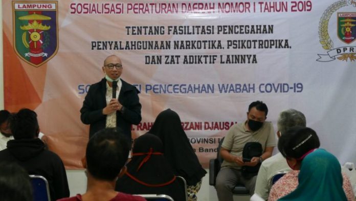 BANDARLAMPUNG (PeNa) – Sekretaris Komisi V DPRD Provinsi Lampung, Rahmat Mirzani Djausal (RMD), melangsungkan Sosialisasi Perda (Sosperda) Nomor 1 Tahun 2019 Tentang Fasilitasi Pencegahan dan Penyalahgunaan Narkotika, Psikotropika serta Zat Adiktif lainnya.