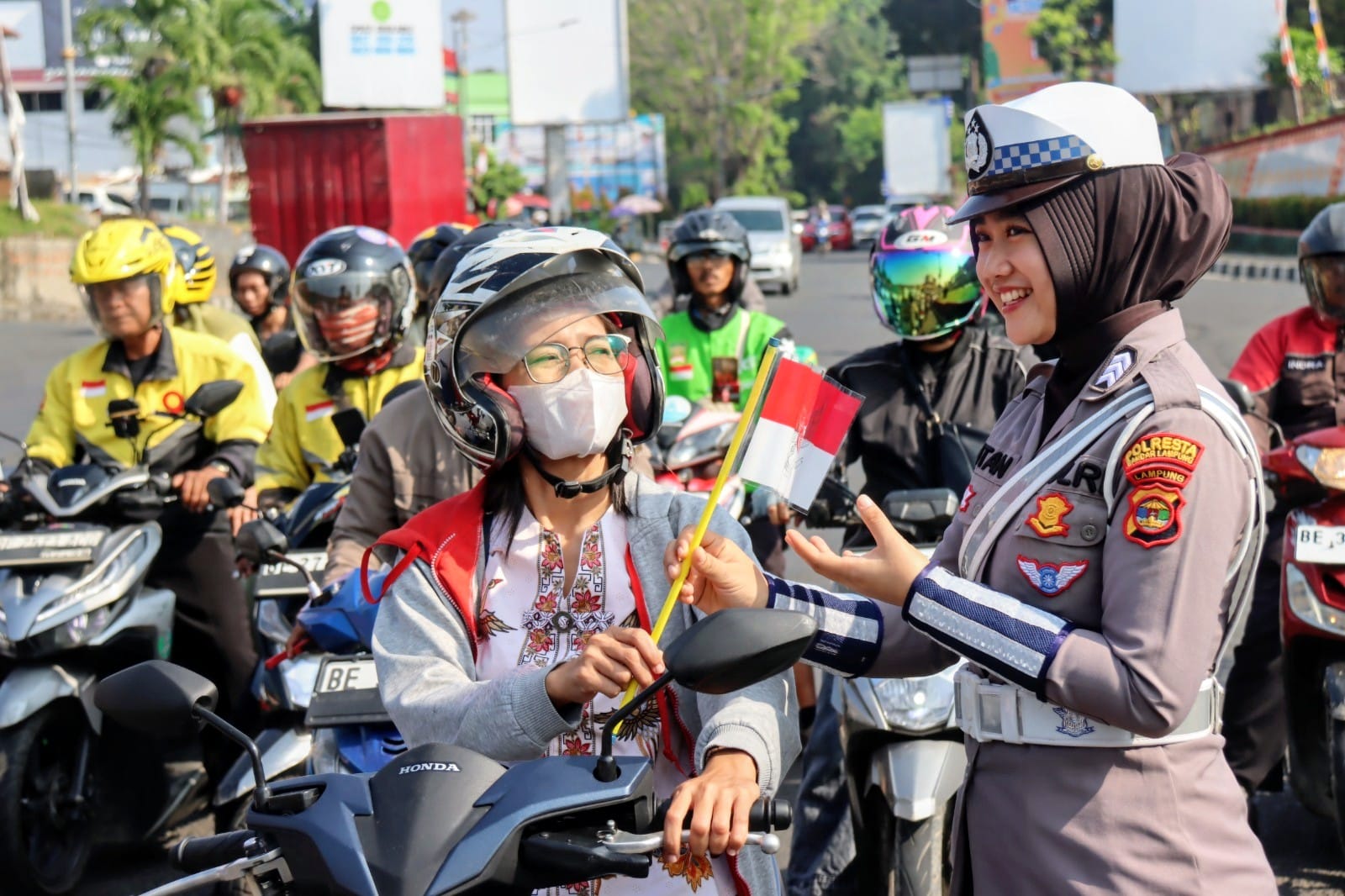 Selain membagikan bendera, petugas Satlantas juga menyisipkan pesan penting tentang keselamatan berkendara kepada masyarakat yang melintas di lokasi kegiatan tersebut.