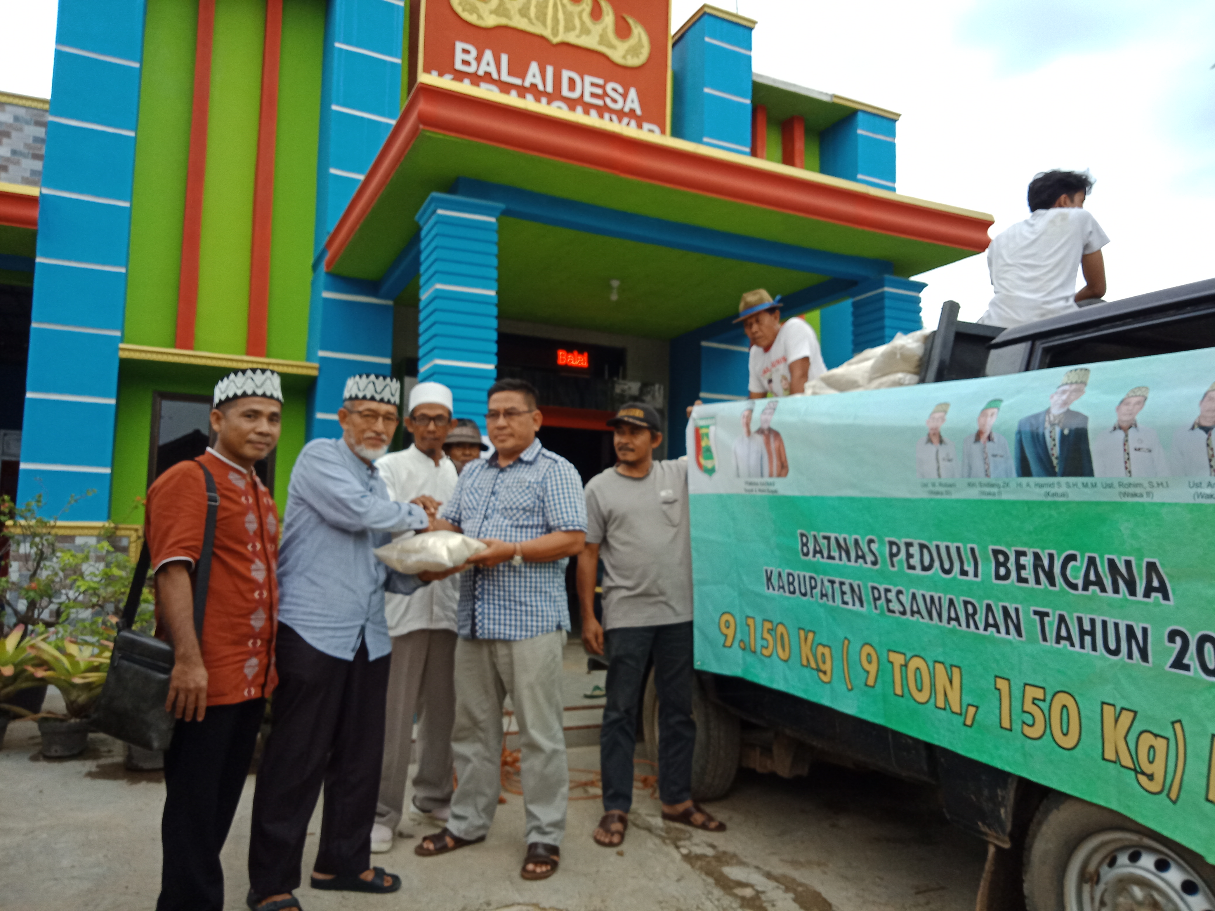 PESAWARAN-(PeNa), Badan Amil Zakat Nasional (BAZNAS) Kabupaten Pesawaran menyalurkan bantuan beras 9150 Kilo Gram (Kg) kepada korban bencana banjir bandang di empat desa yakni di Desa Begelen, Desa Karang Anyar, Desa Gedong Tataan dan Sukaraja, Ahad (26/01/2020).