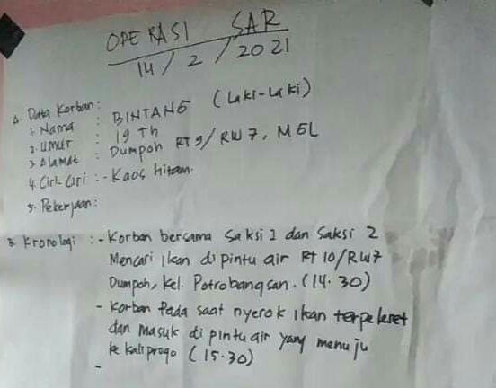 Menurut Tomi, kronologi bermula ketika Bintang (19) Warga kampung setempat yang tinggal di RT. 09 RW.07 tersebut bersama dua orang rekannya pada Minggu (14/02/21) pukul 14.30 WIB memulai mencari ikan dengan Serok/Seser di pintu air yang menuju ke kali Progo.