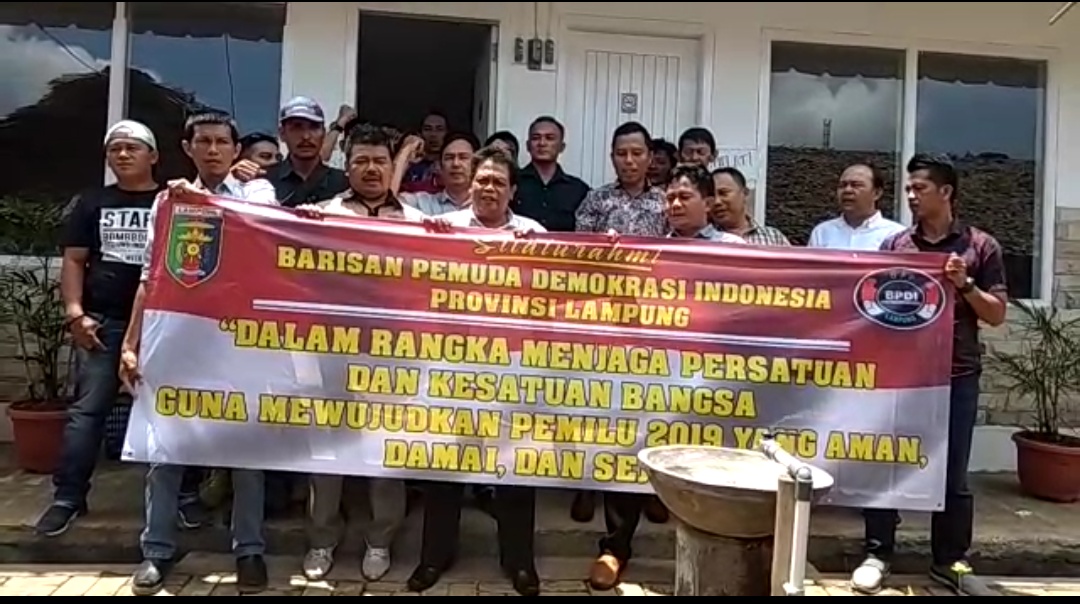 Bandar Lampung – Barisan Pemuda Demokrasi Indonesia (BPDI) Provinsi Lampung, mengelar deklarasi damai, guna mendukung kesuksesan pemilu 2019 aman, sejuk dan damai di Aula mawar, Riu resto Bandar Lampung, Minggu (24/02/2019).