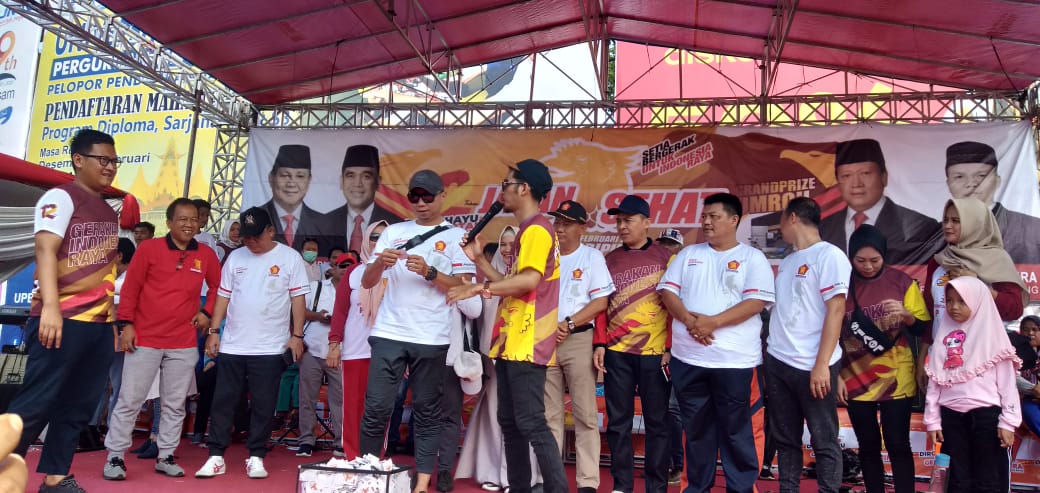 BANDARLAMPUNG (PeNa) – Sekjen DPP Partai Gerindra Ahmad Muzani, Ketua DPD Partai Gerindra Provinsi Lampung Gunadi Ibrahim serta Walikota Bandarlampung Herman H. N. turut hadir dalam acara jalan sehat yang diikuti ribuan peserta dalam rangka memperingati Hari Ulang Tahun Partai Gerindra ke 12. Kegiatan tersebut digelar di Tugu Adipura, Enggal, Bandarlampung, Minggu (23/2/2020).