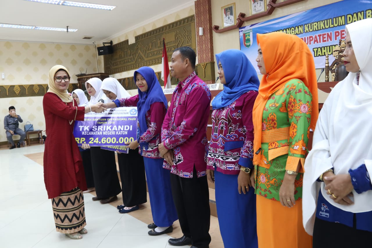 PESAWARAN-(PeNa), Bunda Pendidikan Anak Usia Dini (PAUD) Kabupaten Pesawaran Nanda Indira Dendi menyerahkan dana Bantuan Operasional PAUD (BOP) Tahun Anggaran 2018 secara simbolis di Aula Pemkab Pesawaran, Rabu (05/12).