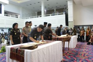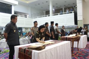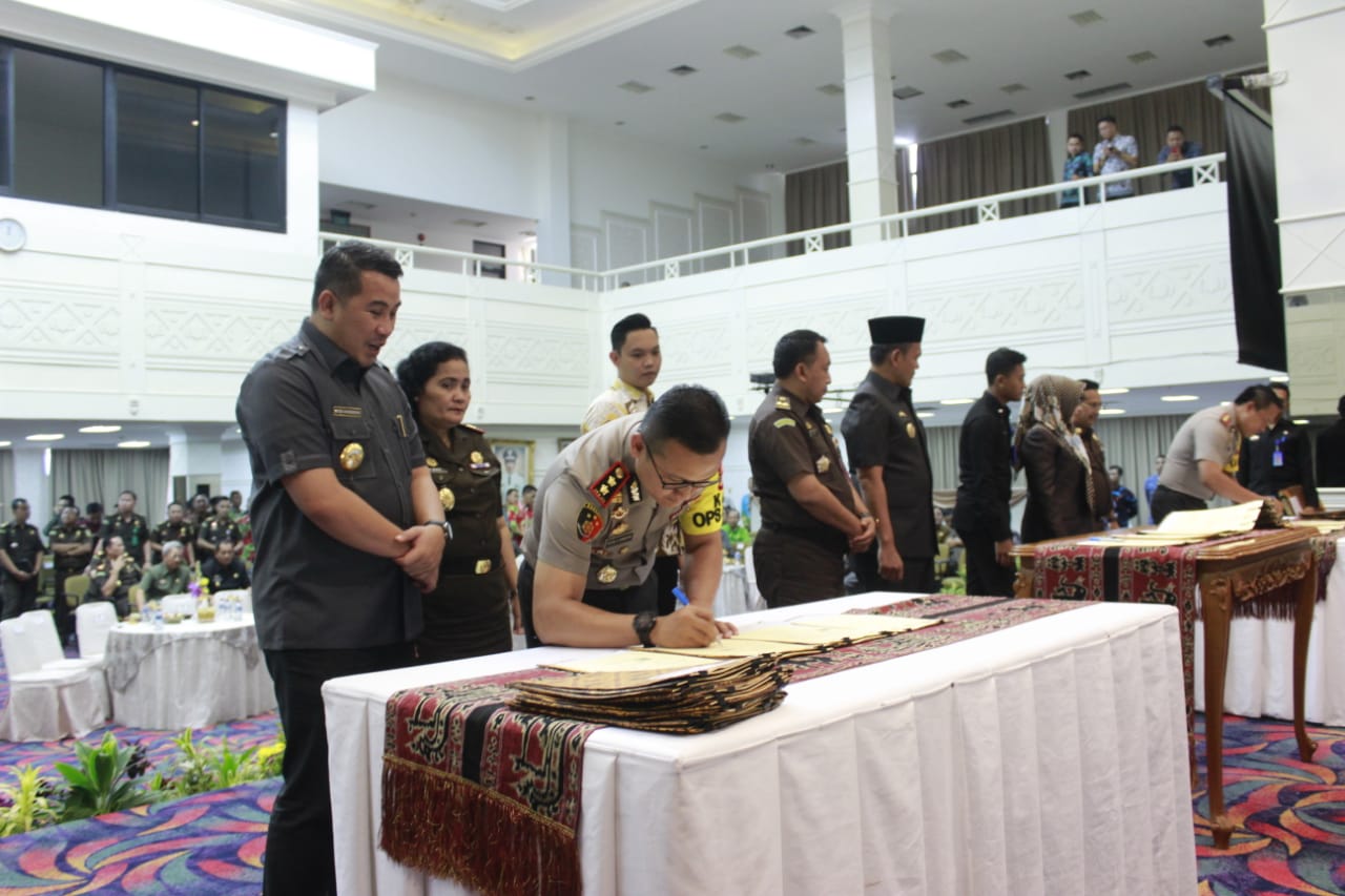 Penandatanganan Perjanjian Kerjasama (PKS) antar Pemerintah daerah (Pemda) Kabupaten atau Kota dengan Kejaksaan Negeri (Kejari) dan Kepolisian resort (Polres) dilakukan di Balai Keratun Komplek Kantor Gubernur Lampung Jalan Wolter Mongonsidi nomor 65 Kota Bandarlampung.