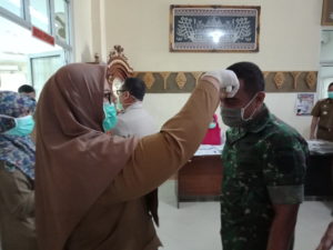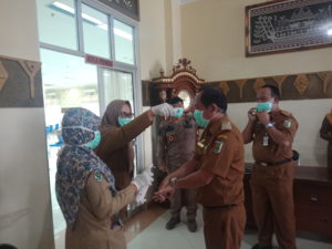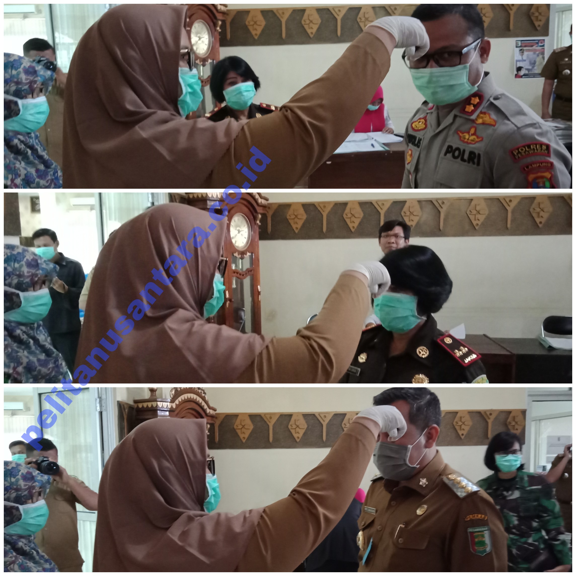 PESAWARAN-(PeNa), Tim medis memeriksa seluruh peserta Rapat Koordinasi Gugus Tugas Pencegahan Covid-19 di Wilayah Kabupaten Pesawaran yang digelar di Aula Teluk Ratai Kantor Pemerintah daerah (Pemda) setempat, Senin (23/03/2020).