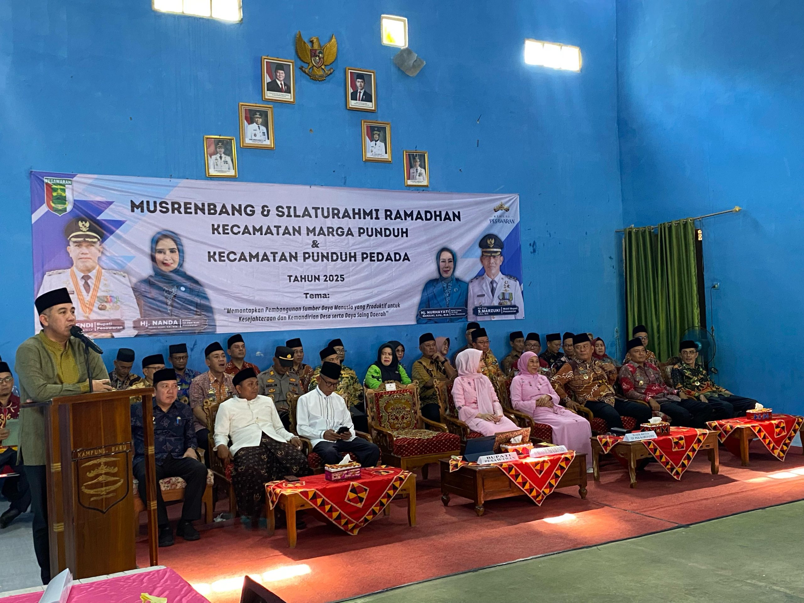 P E S A W A R A N -(PeNa), Bupati Pesawaran Dendi Ramadhona mendorong optimalisasi program melalui Musyawarah perencanaan Pembangunan (Musrenbang) tingkat Kecamatan di GSG Balai Desa Kampung Baru, Kecamatan Marga Punduh, Kamis (13/03/2025).