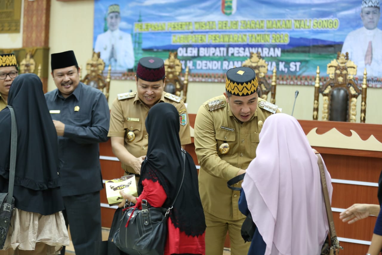 PESAWARAN-(PeNa), Bupati Pesawaran Dendi Ramadhona lepas rombongan wisata rohani ziarah ke Makam Wali Songo termin kedua Kabupaten Pesawaran Tahun Anggaran 2018 di Aula Pemkab setempat, Senin, (26/11).