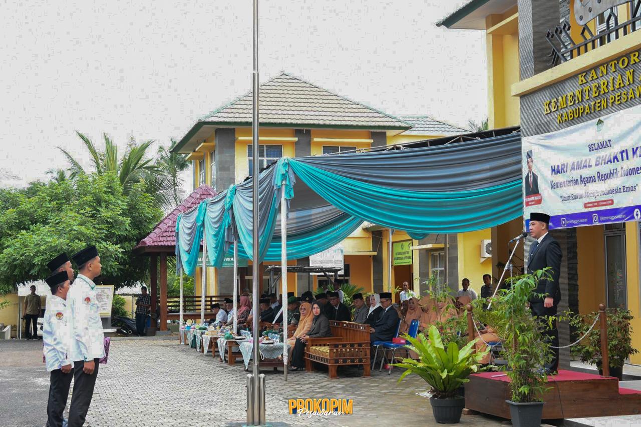 P E S A W A R A N -(PeNa), Kementerian Agama harus terus berkomitmen pada proses reformasi birokrasi dan penguatan meritokrasi dalam tata kelola organisasi. Demikian dikemukakan Bupati Pesawaran Dendi Ramadhona saat memimpin Upacara Peringatan Hari Amal Bhakti ke-79 di halaman Kantor Kementerian Agama Kabupaten Pesawaran pada Jum’at, (03/01/2025)