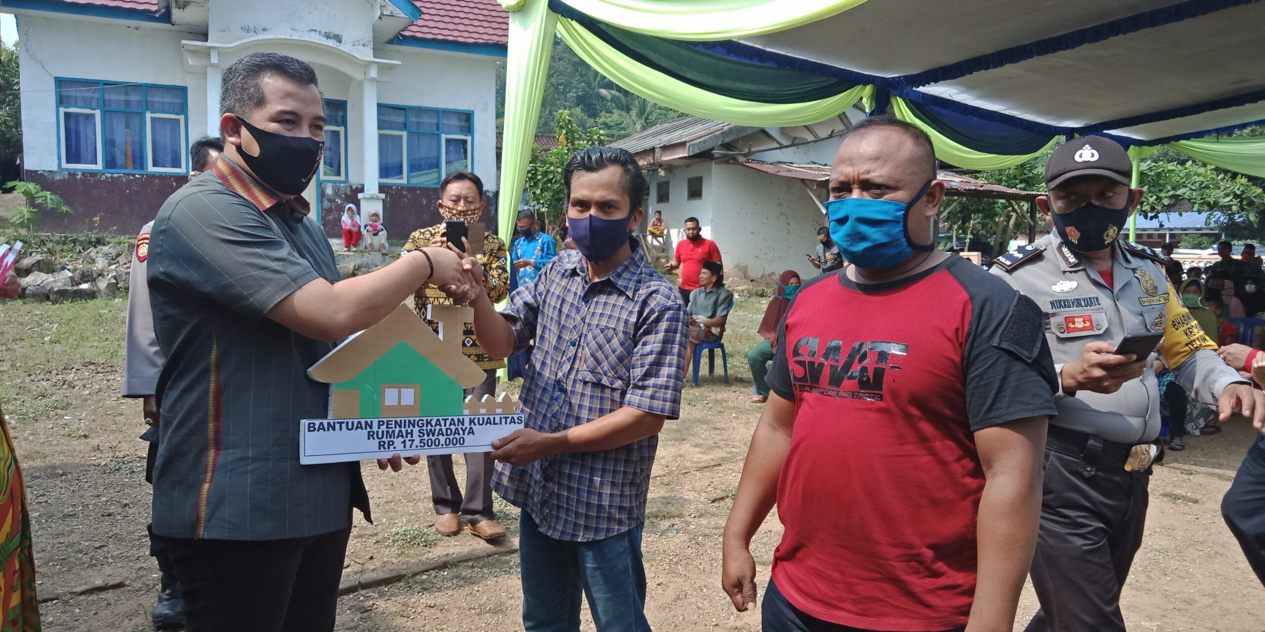 “Untuk itu, saya minta tolong kepada Kepala Desa dan masyarakat sekitar dapat membantu saudara-saudara kita dalam merealisasikan bantuan bedah rumah dengan mendapat material senilai Rp17.500.000,-. Tolong gotong royong, biar dapat terbangun rumah sehat layak huninya, ” ujar dia.