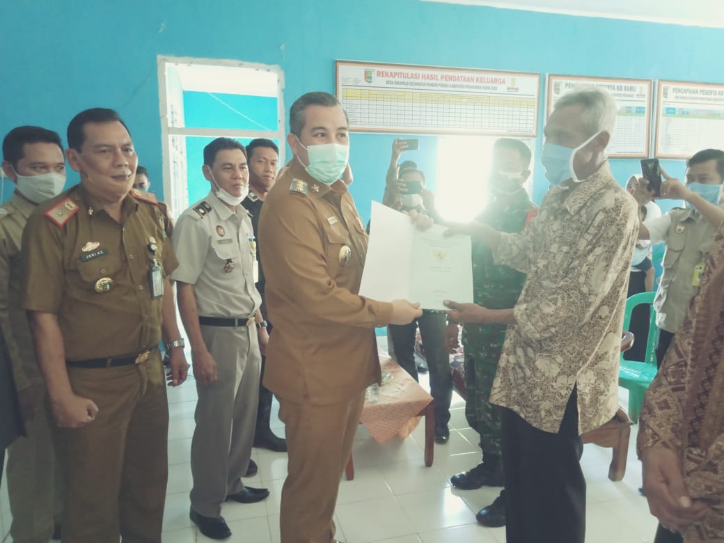 PESAWARAN-(PeNa), Bupati Pesawaran Dendi Ramadhona menyerahkan sertifikat tanah secara simbolis kepada 100 nelayan di Desa Sukamaju Kecamatan Punduh Pidada, Senin (10/08/2020).