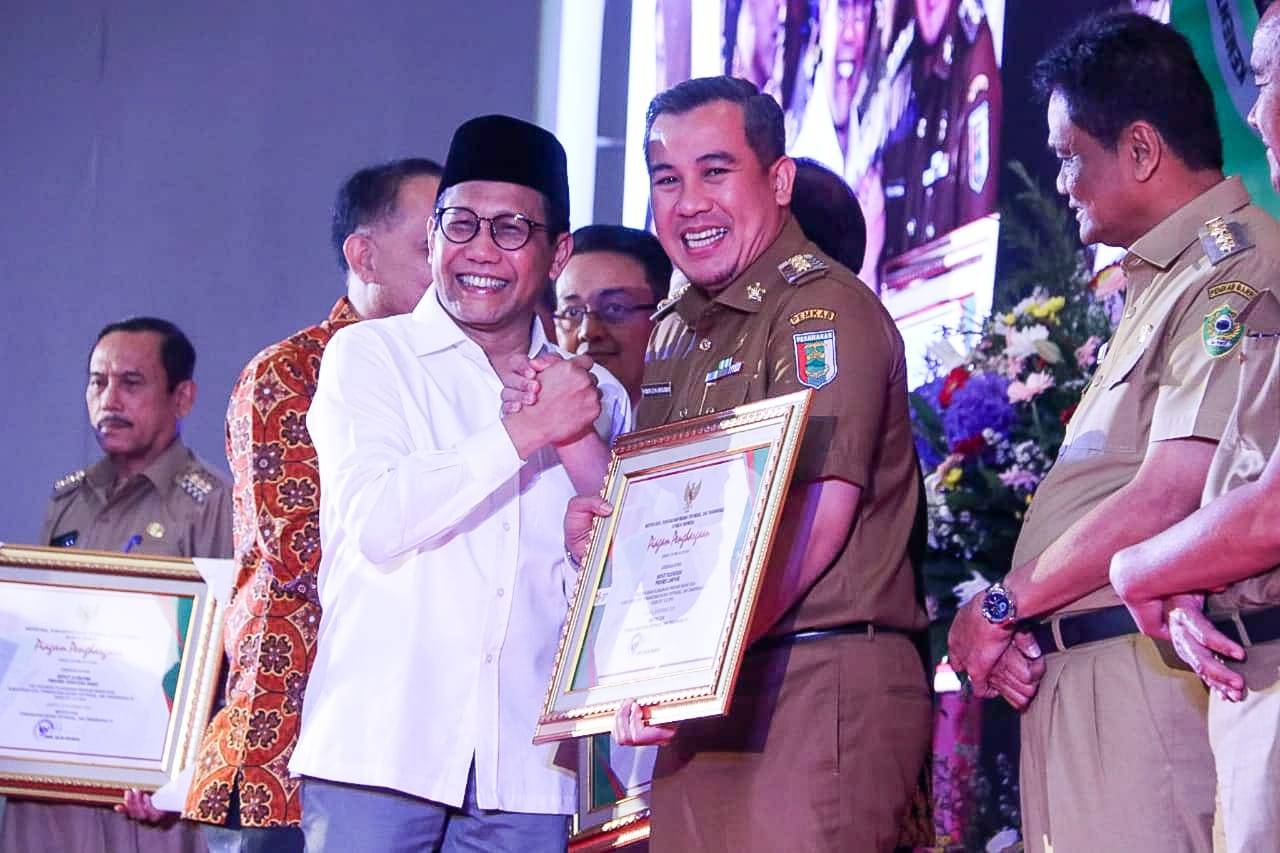 PESAWARAN-(PeNa), Bupati Pesawaran Dendi Ramadhona menerima penghargaan program inovasi desa terbaik dari Kementrian Desa Pembangunan Daerah Tertinggal dan Transmigrasi di Hotel Merlynn Park Jakarta, Senin (25/11/2019).
