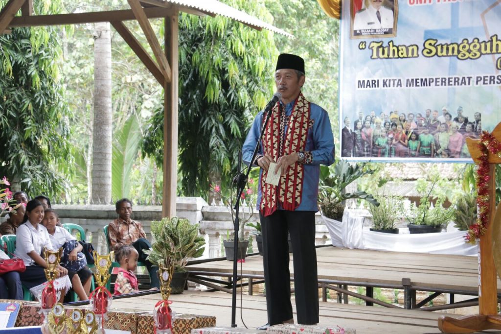 PRINGSEWU-(PeNa), Bupati Pringsewu Sujadi bersama Wakil Ketua DPRD Pringsewu S. Nainggolan menghadiri perayaan Paskah Bersama Unit Pastoral Hati Kudus Yesus di Gereja Santo Paulus, Desa Totokarto Kecamatan Adiluwih, Kabupaten Pringsewu, Minggu (6/5).