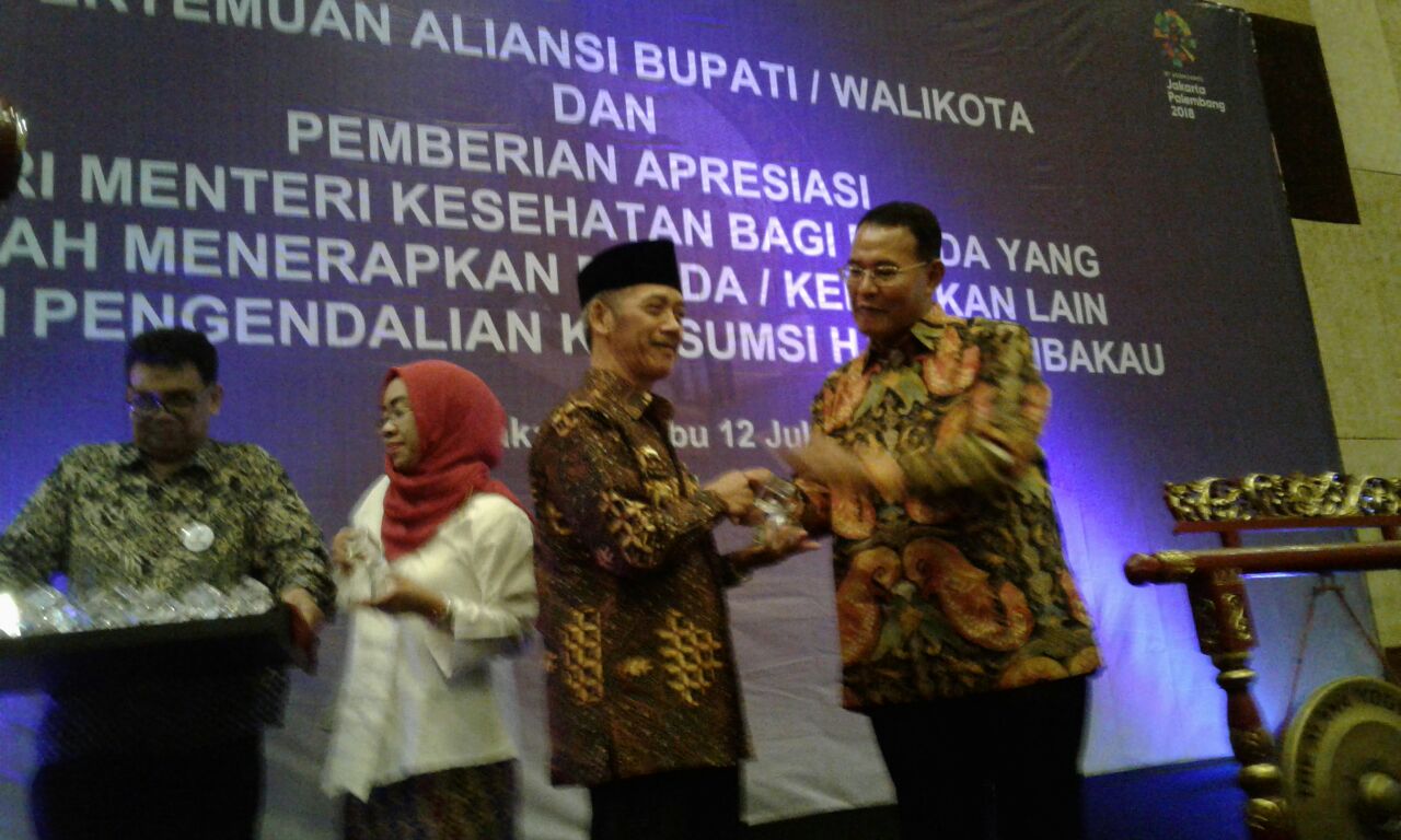 PRINGSEWU-(PeNa), Bupati Pringsewu, Sujadi menerima apresiasi dan penghargaan Pastika Parahita dari pemerintah pusat.Penghargaan tersebut diberikan pemerintah melalui Kementerian Kesehatan kepada pemerintah daerah yang dinilai berhasil dalam upaya pengendalian konsumsi tembakau,” Pengendalian dimaksud, diantaranya dengan memiliki Peraturan Daerah tentang Kawasan Tanpa Rokok (KTR) atau peraturan sejenis lainnya. Sekaligus bertujuan agar pemerintah daerah dapat mengimplementasikan peraturan tersebut secara lebih optimal.” kata dia, Jumat (14/7).