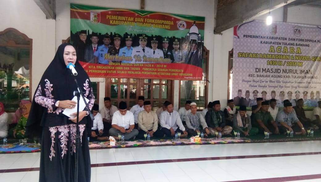 TULANG BAWANG-(PeNa), Bupati Tulang Bawang Winarti melakukan peringatan Nuzulul Qur’an sekaligus safari ramadhan 1439 Hijriah di Masjid Nurul Iman Kampung Tunggal Warga Kecamatan Banjar Agung, Selasa (5/6).