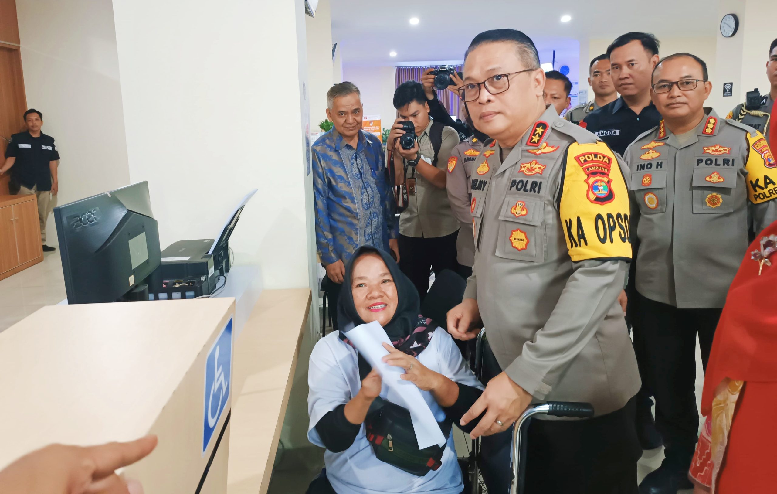 Kapolda Helmy Santika dengan tulus mendekati seorang wanita penyandang disabilitas yang menunggu pemanggilan nomor antrian. Mereka berkomunikasi mengenai keperluan wanita tersebut, yang ternyata ingin membuat surat kehilangan.