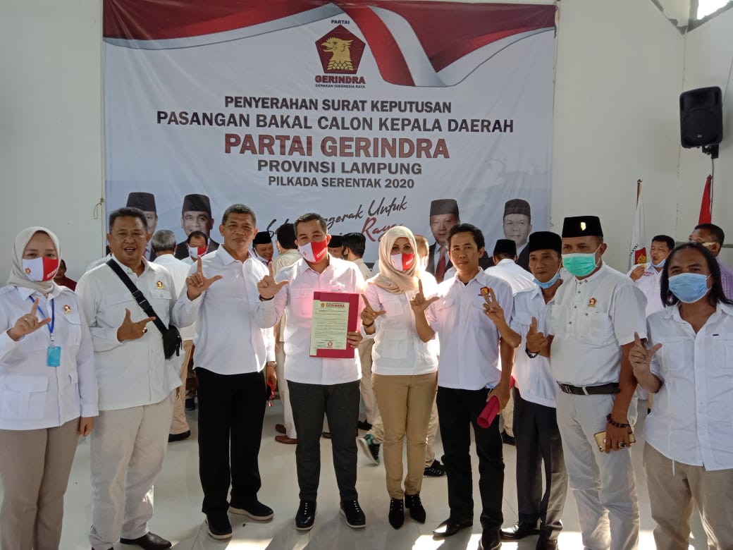 PESAWARAN-(PeNa), Pasangan bakal calon Bupati Dendi Ramadhona dan Wakil Bupati Marzuki kembali menerima rekomendasi. Kali ini, Partai Gerindra menyerahkan rekomendasi kepadanya di Kantor DPD Gerindra Lampung, Kamis (27/08/2020).