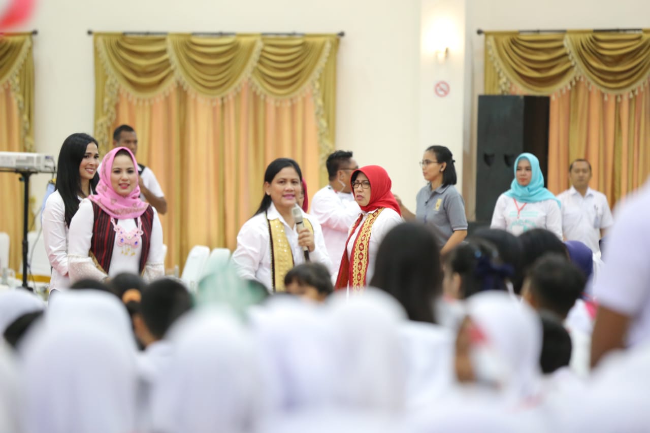 “Apa kabar anak-anak, apakah anak-anak sudah diberikan sosialisasi narkoba. Kalau sudah ibu mau tanya, coba jelaskan ciri-ciri pengguna narkoba, ” tanya Iriana.