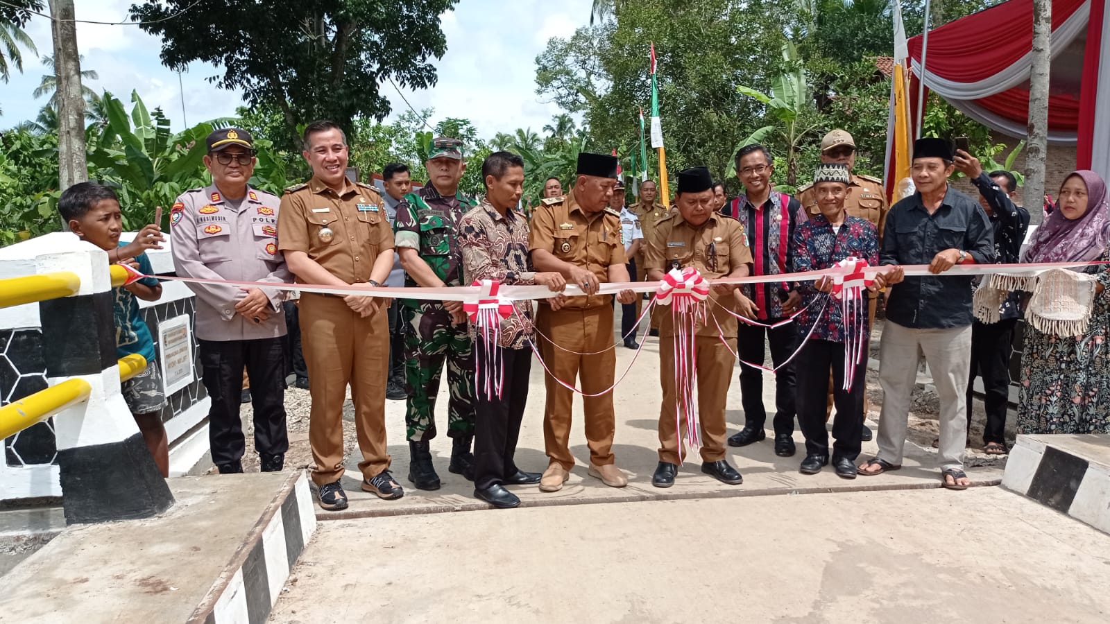 P E S A W A R A N – (PeNa), Bupati Pesawaran Dendi Ramadhona bersama Kepala Desa Wiyono Kecamatan Gedong Tataan M.Toha meresmikan jembatan Kampung Sawah Way Linti Gunung Rejo (Kawagu) di Desa Wiyono, Senin (08/01/2024).