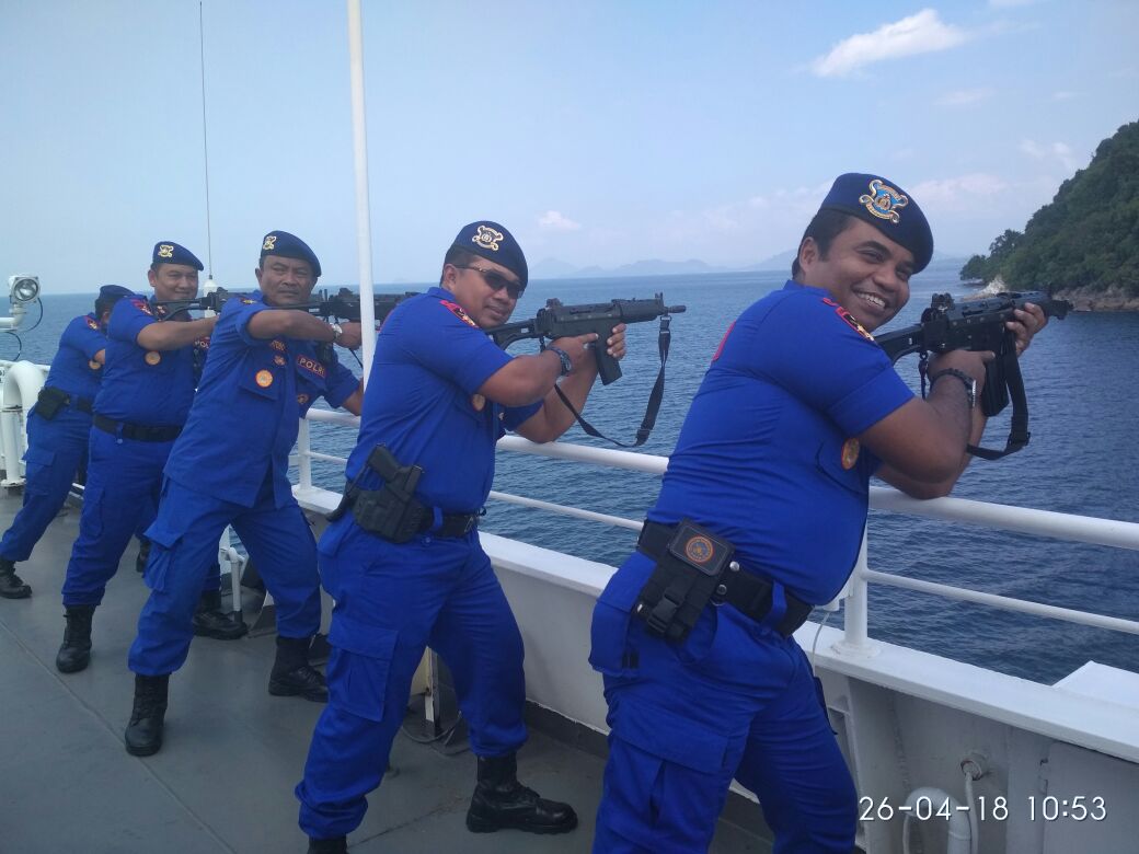 BANDARLAMPUNG (PeNa) –Gunakan senjata serbu SS1V5, Personel Direktorat Polair Polda Lampung latihan menembak diatas KP Hanoman 7011 Baharkam Mabes Polri, di wilayah perairan Pulau Tegal, Kecamatan Teluk Pandan, Kabupaten Pesawaran, Lampung, pada Kamis (26/4) siang.