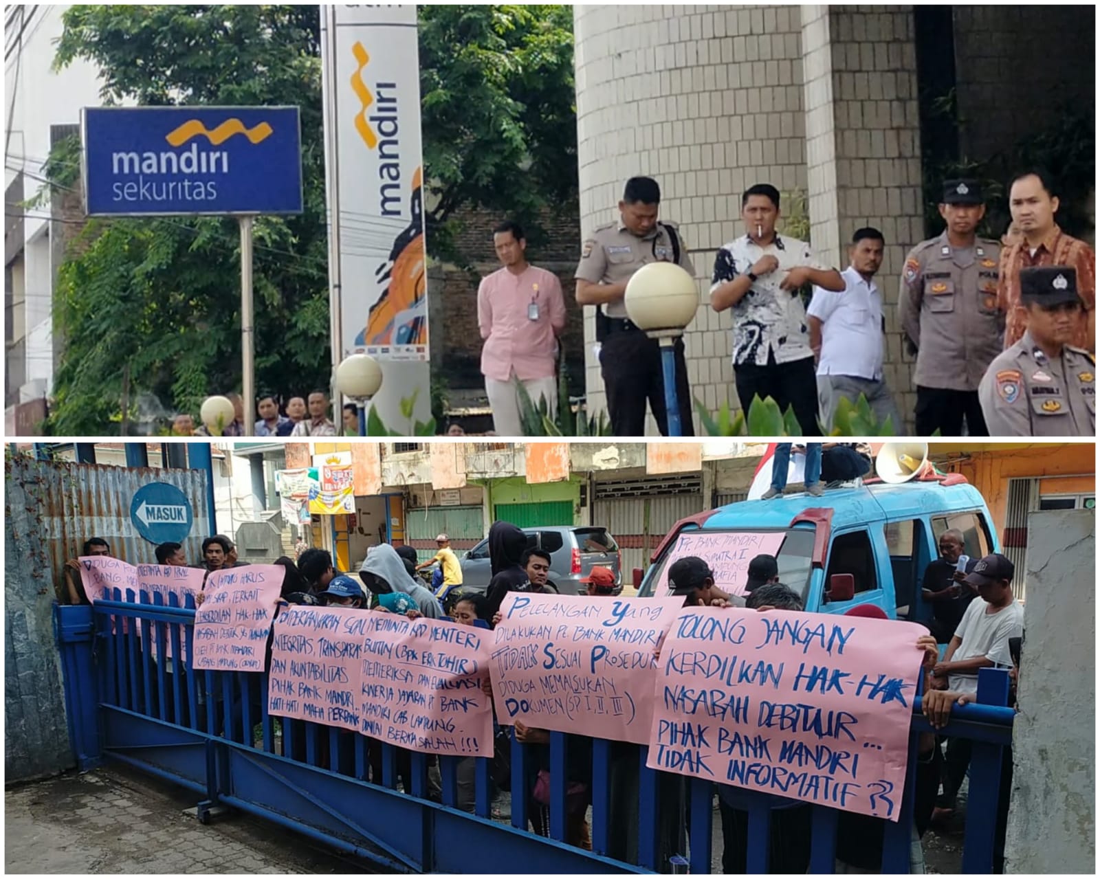 “Pelelangan Sepihak Yang Dilakukan PT Bank Mandiri Cabang Lampung terhadap debitur PT. Mandiri Tehnido Jaya yang kami nilai cacat prosedur dan terindikasi telah terjadi manipulasi data,” ungkapnya.