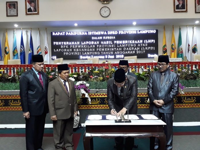 Rapat paripurna yang dihadiri Ketua DPRD Provinsi Lampung Dedi Afrizal beserta jajaran wakil ketua, Plt Sekprov Lampung Hamartoni Ahadis dan Kepala BPK RI Perwakilan Lampung Sunarto memberikan apresiasi kepada Pemerintah Provinsi Lampung kembali meraih Opini Wajar Tanpa Pengecualian (WTP) yang ke 4 kalinya dari Badan Pemeriksa Keuangan (BPK) RI Perwakilan Lampung atas laporan keuangan Pemerintah Daerah Provinsi Lampung Tahun 2017.