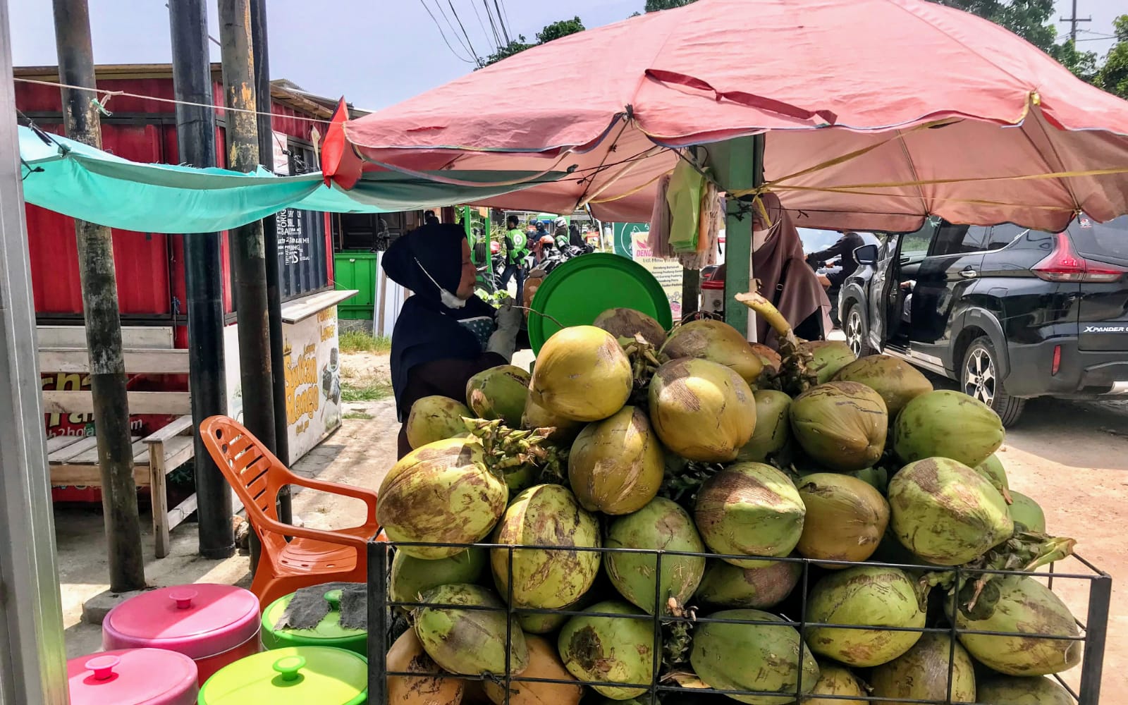 Dengan cekatan, ia membelah kelapa, menuangkan air segarnya, dan menambahkan es batu untuk menyajikan minuman yang menyegarkan.