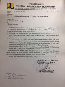 Bandar Lampung (PeNa)-Kementerian Pekerjaan umum dan Perumahan Rakyat (Kemen PuPera )meminta Pemerintah Kota Bandar Lampung untuk menghentikan pembangunan Fly Over MBK disebabkan belum memenuhi Readlines Criteria dan ijin pelaksanaan di aset jalan nasional yang diterbitkan Kemen PuPera.