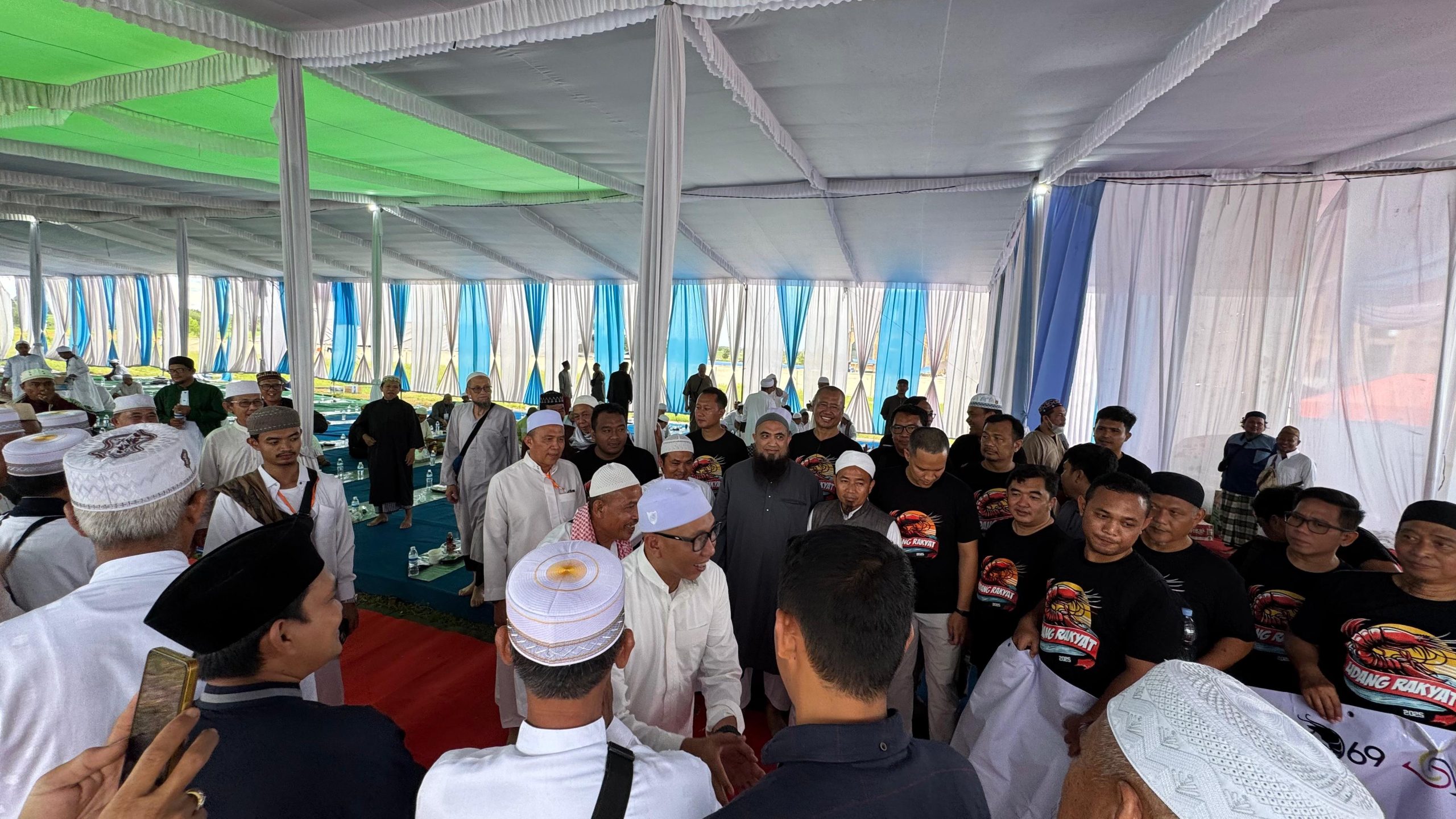Ribuan jamaah tampak antusias mengikuti kegiatan masak bersama dan makan bersama, yang menjadi momen hangat dalam acara tersebut.
