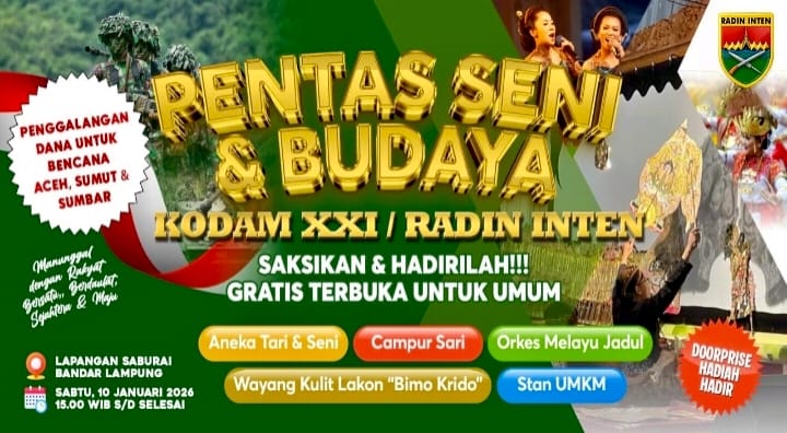 BANDARLAMPUNG – (PeNa), Kodam XXI/Radin Inten akan menggelar Pentas Seni dan Budaya Keberagaman pada 10 Januari 2026 mendatang. Kegiatan ini terbuka gratis untuk masyarakat, sekaligus menjadi ajang penggalangan donasi kemanusiaan bagi korban bencana di wilayah Sumatera.