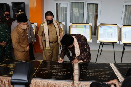 BANDARLAMPUNG (PeNa) – Gubernur Lampung Arinal Djunaidi mendampingi Menteri Agama Republik Indonesia Jenderal TNI (Purn) Fachrul Razi melakukan Penandatanganan Prasasti dalam rangka peresmian pembangunan Asrama Haji, Pusat Pelayanan Haji dan Umrah Terpadu (PLHUT) dan Gedung Balai Nikah dan Manasik Haji Kantor Urusan Agama (KUA) Provinsi Lampung di Gedung Orange Asrama Haji, Bandar Lampung, Selasa (11/8/2020).