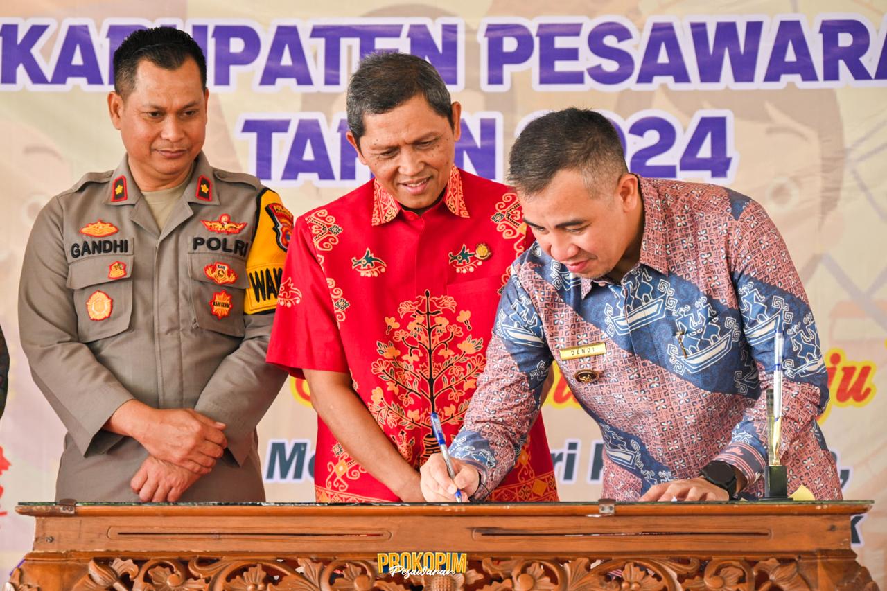 P E S A W A R A N -(PeNa), Tepat di Hari Anak Nasional (HAN), Bupati Pesawaran Dendi Ramadhona menandatangani Memory of Understanding (MoU) Komitmen Bersama di Gedung Serba Guna Lamban Agung Komplek Rumah Dinas Bupati, Desa Negeri Sakti Kecamatan Gedong Tataan, Jum’at (26/07/2024) kemarin.