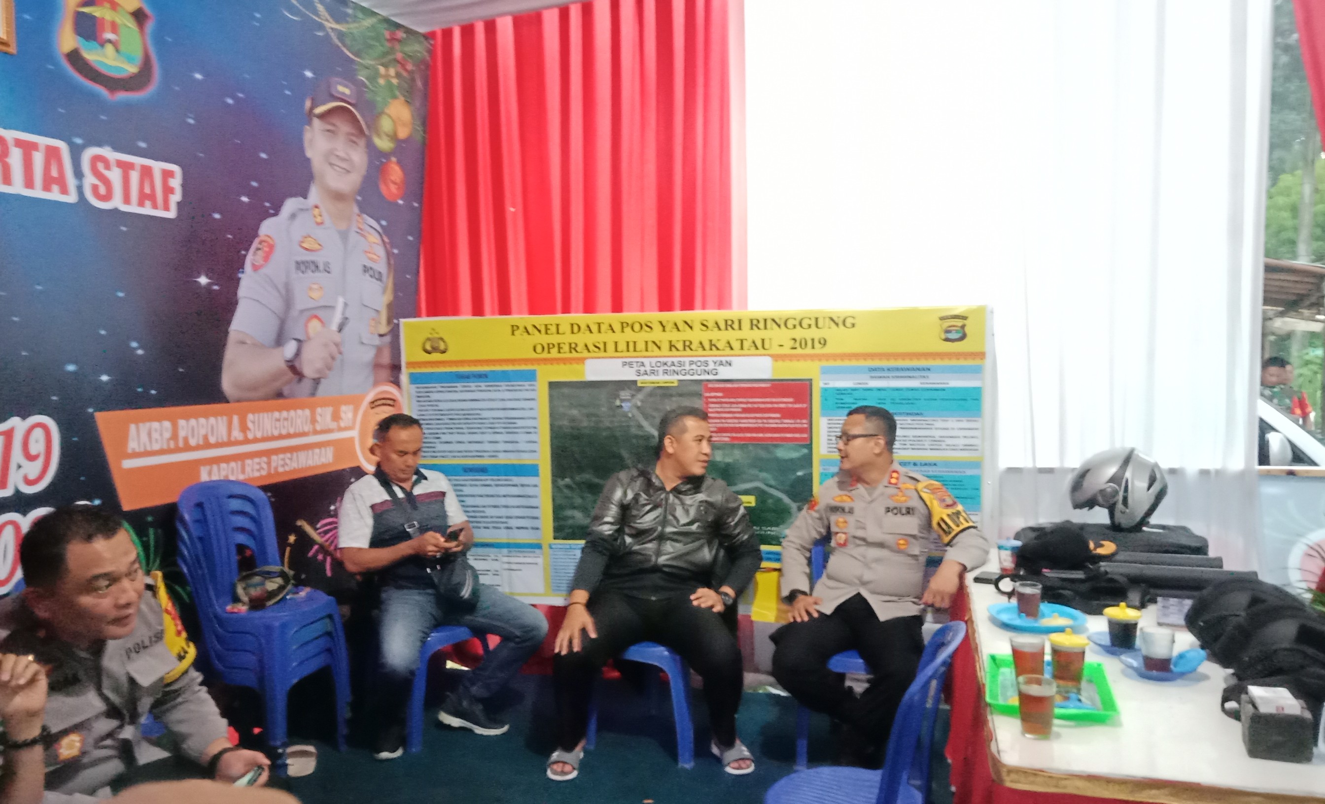 Kedatangannya disambut langsung Kapolres Pesawaran AKBP Popon Ardianto Sunggoro bersama jajarannya di Pos Pam Nataru 2020 Ringgung. Bupati Dendi Ramadhona bersama jajaran terkait meski dengan guyuran hujan.