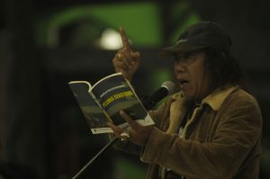 PADANG-(PeNa), Salah satu kegiatan di Hari Pers Nasiional (HPN) 2018 adalah pembacaan puisi. Peserta asal Lampung Isbedy Setiawan ZS, tampil memukau dalam pentas puisi, di Theater Terbuka Taman Budaya Kota Padang Sumatera Barat, Rabu malam (7/2).