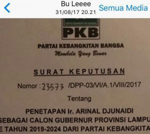 Pasalnya sebelum deklarasi dan kepastian dukungan PKB terhadap Arinal, publik lebih dahulu mengetahui dengan beredarnya screeshoot pesan WhatsApp yang diduga berasal dari Nyonya Lee yang memuat dukungan PKB pada mantan Sekdaprov.