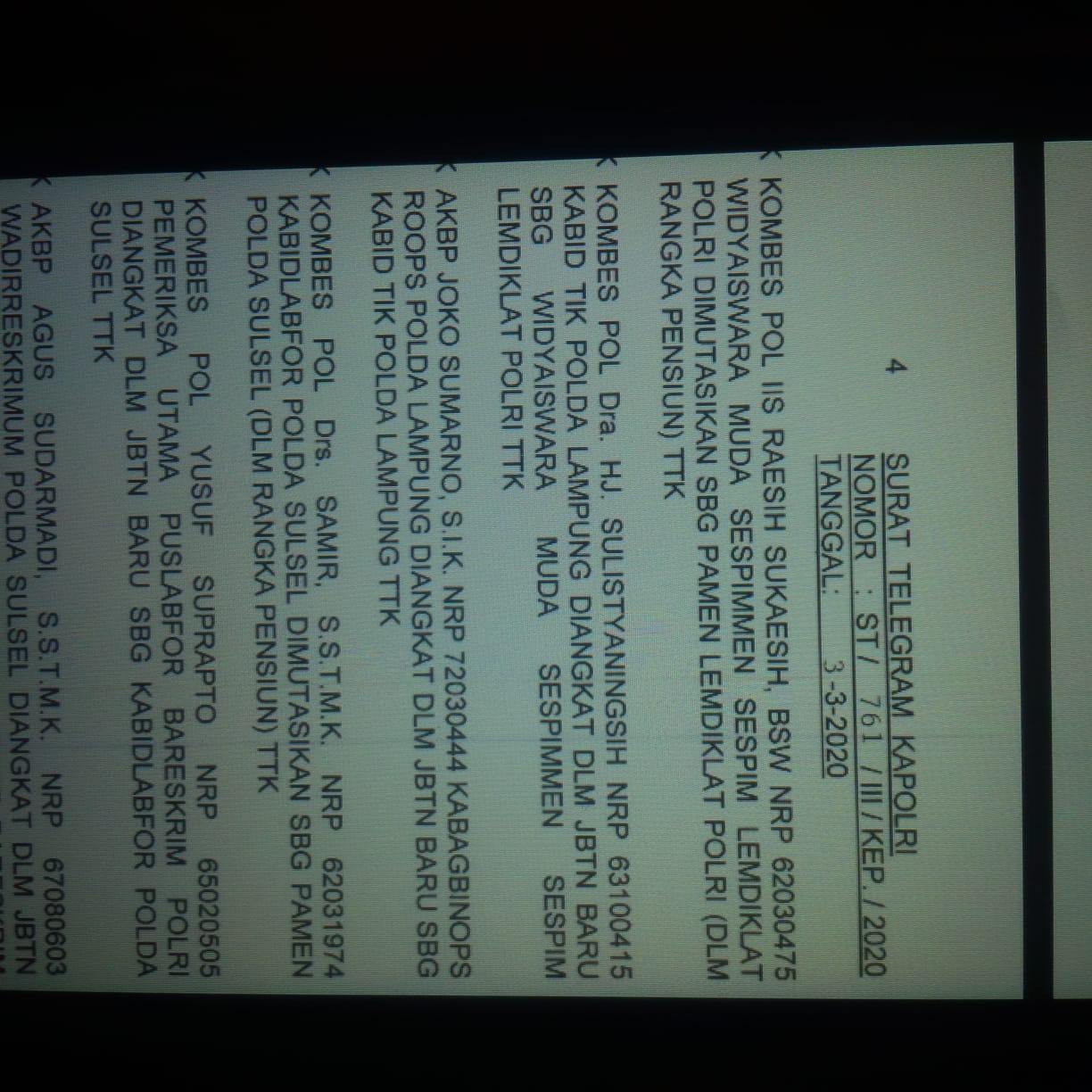 Pergantian berdasarkan Surat Telegram Kapolri Nomor : ST/761/III/2020, Tanggal 3-3-2020. Pada ST tersebut, ditertulis nama pejabat Kabid TIK Polda Lampung, Kombes Pol. Sulistiyaningsih, diangkat dalam jabatan baru sebagai Widyaiswara Muda Sespimen Sepim Lemdiklat Polri.