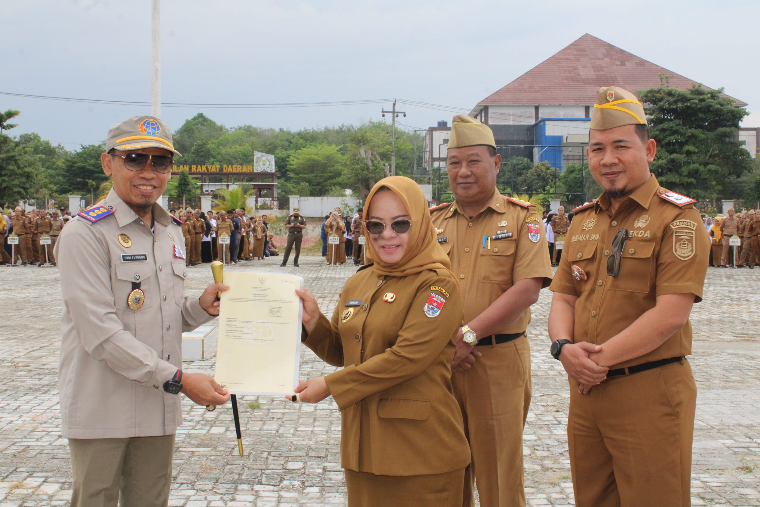 M E S U J I -(PeNa), Kepala Kantor (Kakan) Kementerian Agraria dan Tata Ruang/Badan Pertanahan Nasional (ATR/BPN) Mesuji Endi Purnomo menyerahkan 30 (tiga puluh) Sertipikat Hak Pakai Tanah Barang Milik Daerah (BMD) Pemerintah Kabupaten Mesuji di Halaman Kantor Pemerintah Kabupaten Mesuji, Senin (29/09/2025).