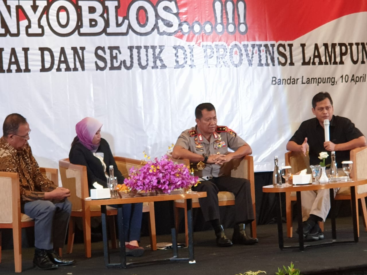 Demikian dikemukakan Kapolda Lampung, Irjen Pol. Purwadi Arianto saat giat Focus Group Discussion (FGD) bertema, “Ayo Nyoblos” Pemilu 2019, Aman, Damai dan Sejuk, di Ballroom Hotel Emersia, Bandarlampung, Rabu (10/04).