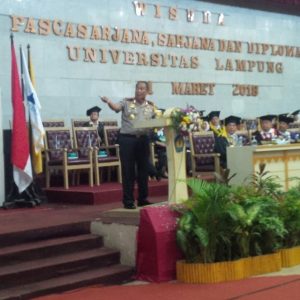 BANDARLAMPUNG-(PeNa), Kapolda Lampung, Irjend Pol Suntana meminta sarjana bisa mandiri dalam menghadapi tantangan kemajuan teknologi kedepan. Demikian dikatakan kepada 876 peserta Pasca Sarjana, Sarjana dan Diploma Universitas Lampung (Unila) di Gedung Serba Guna (GSG) Unila, pada Rabu (21/3) siang.