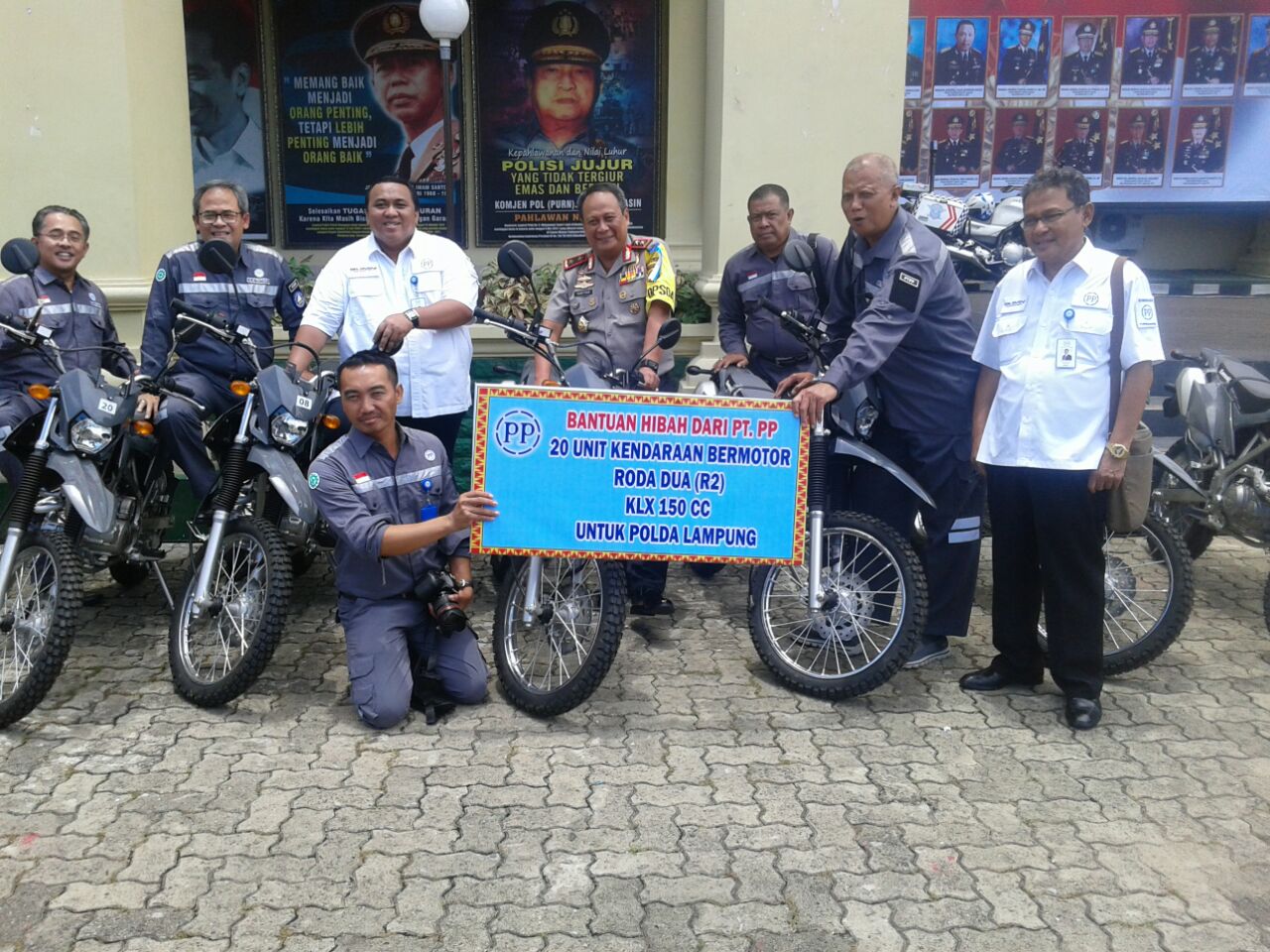 Penyerahan sepeda motor tersebut merupakan hibah yang dilakukan secara simbolik oleh Kapolda Lampung dengan penggede dua perusahaan milik negara. “Bantuan sepeda motor jenis Kawasaki KLX sangat berarti bagi para personel Bhabinkamtibmas Polda Lampung dan Jajaran, untuk itu saya mengucapakan terimakasih banyak kepada bapak Presiden Komisaris PT PP (Persero) Tbk, Andi Gani Nenawea dan bapak Direktur SDM dan Umum PT Bukit Asam, Joko Pramono, atas bantuannya,” kata Irjend Pol Suntana.