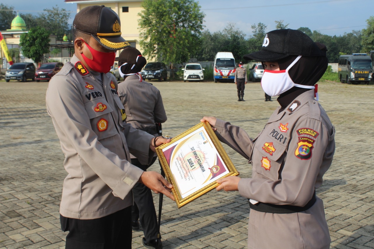 PESAWARAN-(PeNa), Kapolres Pesawaran AKBP Vero Aria Radmantyo serahkan penghargaan juara I Lomba Vlog Dalam Rangka HUT Bhayangkara Ke-74 kepada Bripka Sisca Indria di Lapangan Mapolres setempat, Senin (13/07/2020).