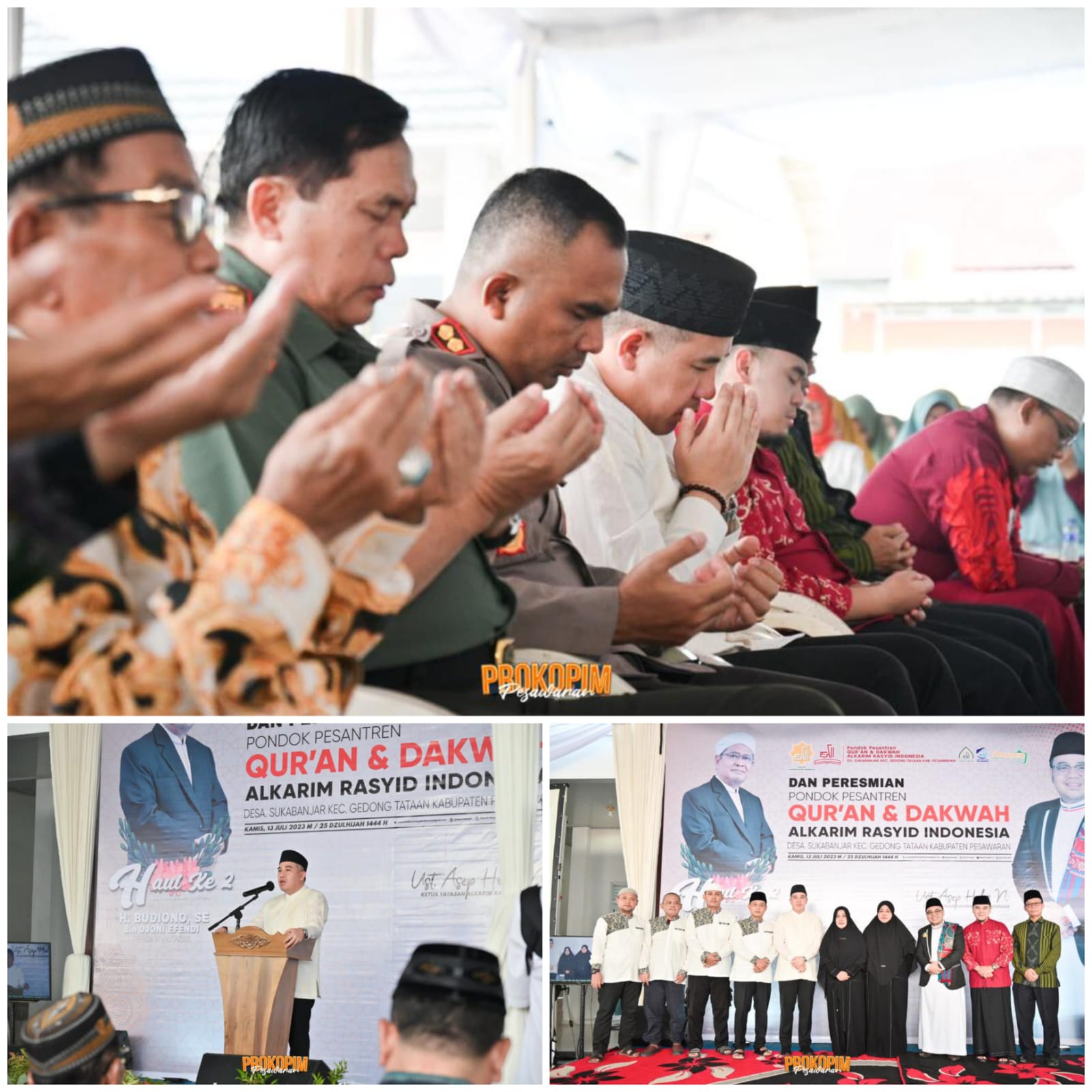 P E S A W A R A N – (PeNa), Bupati Pesawaran Dendi Ramadhona dan Kapolres AKBP Pratomo Widodo, mengikuti Tahlil dan Do’a Bersama pada Haul ke-2 Wafatnya Almarhum Budiyono Bin Djoni Efendi sekaligus meresmikan Pondok Pesantren Qur’an dan Dakwah Al-Karim Rasyid Indonesia, di Desa Sukabanjar Kecamatan Gedong Tataan, Kamis (13/07/2023).