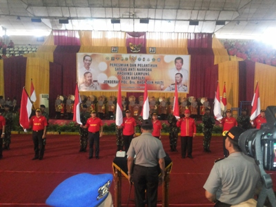 BANDAR LAMPUNG : Kapolri Jenderal melantik puluhan ribu Satgas Anti Narkoba Provinsi Lampung di Gedung Serba Gyna Universitas Lampung Unila), Rabu (18/05/2016).