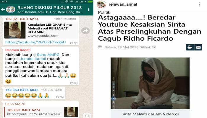 Penyebaran video black campaign yang merugikan Cagub Ridho pertama kali diketahui tersebar melalui pesan WhatsApp menggunakan mlink You Tube dengan akun bernama Eka, Senin (28/05) lalu sedangkan pada Selasa (29/05) akun Instagram relawan_arinal, juga memposting screenshhot video tersebut dengan melampirkan link berita dari media online bergelora.com yang memuat pengakuan Sinta yang belum dapat dipertanggungjawabkan.