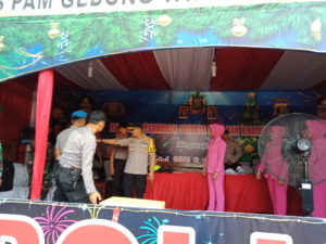 PESAWARAN-(PeNa), Ketua Cabang Bhayangkari Polres Pesawaran Putri Popon A.Sunggoro berikan dukungan kepada jajaran yang melaksanakan tugas di Pos Pengamanan Natal dan Tahun Baru 2020 (Pos Pam Nataru), pertama dilakukan di Pos Tugu Pengantin Gedong Tataan, Jum’at (27/12/2019).