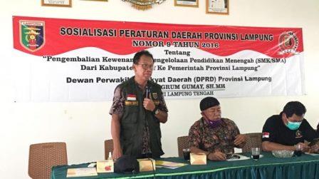 Sementara, Selamet selaku Camat Bumi Ratu Nuban mengatakan ucapan terimakasih kepada Ketua DPRD Provinsi Lampung yang telah menyempatkan hadir. “Kami berharap dengan adanya Sosialisasi ini, para tenaga pendidikan dapat lebih memahami terkait penerapan Peraturan Daerah No 9 tahun 2016. Sosialisasi ini sangat penting bagi kami, karena dalam penerapannya selama ini kami belum memahami teknis dan penerapan Perda tersebut,” tutupnya. (*)